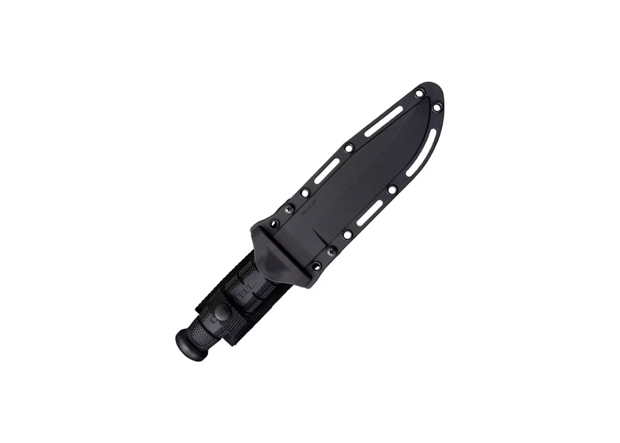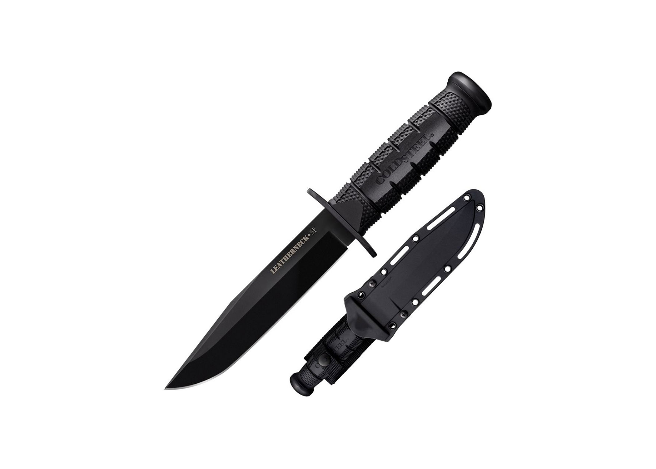 The Cold Steel Leatherneck SF is a rugged, military-inspired fixed blade featuring a hand-honed D2 clip-point blade, secure Kray-Ex grip with steel guard and butt cap, and a versatile Secure-Ex sheath—built for hard use and absolute reliability.