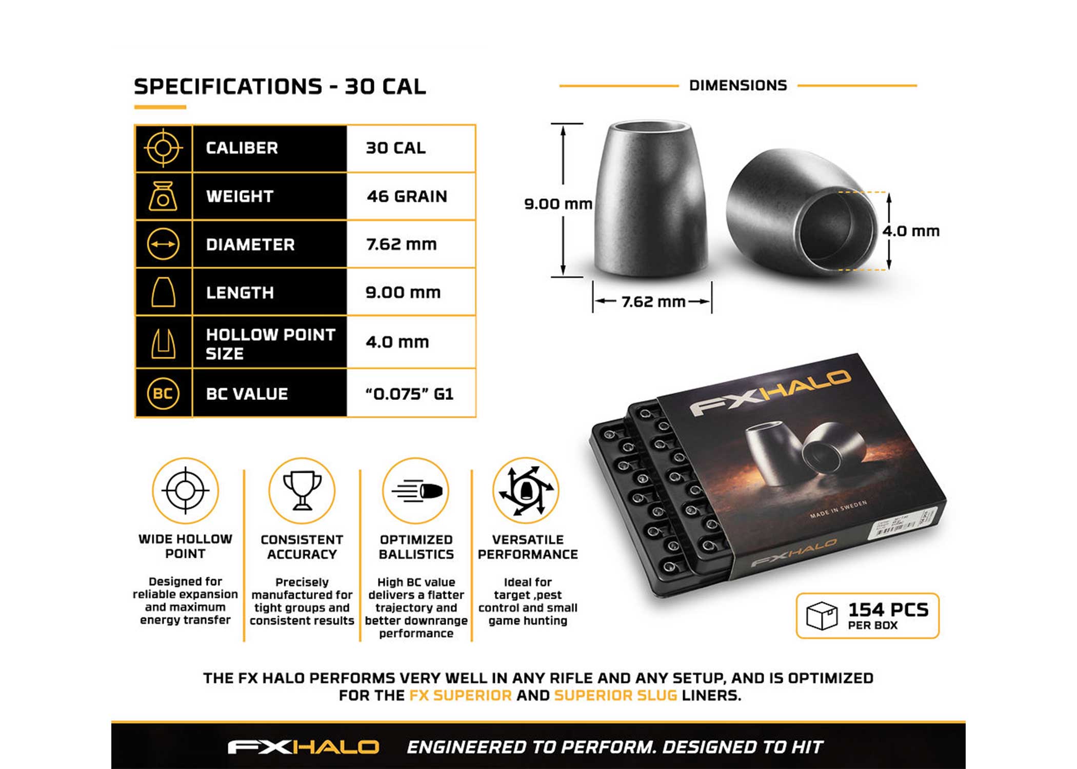 At its core, the FX HALO retains the familiar weight of traditional pellets, making it just as easy to tune within your rifle system. But where it stands apart is in its design. Based on a slug profile, it delivers a much higher ballistic coefficient, offering greater resistance to wind drift and enhanced downrange accuracy, comparable to high-performance slugs.