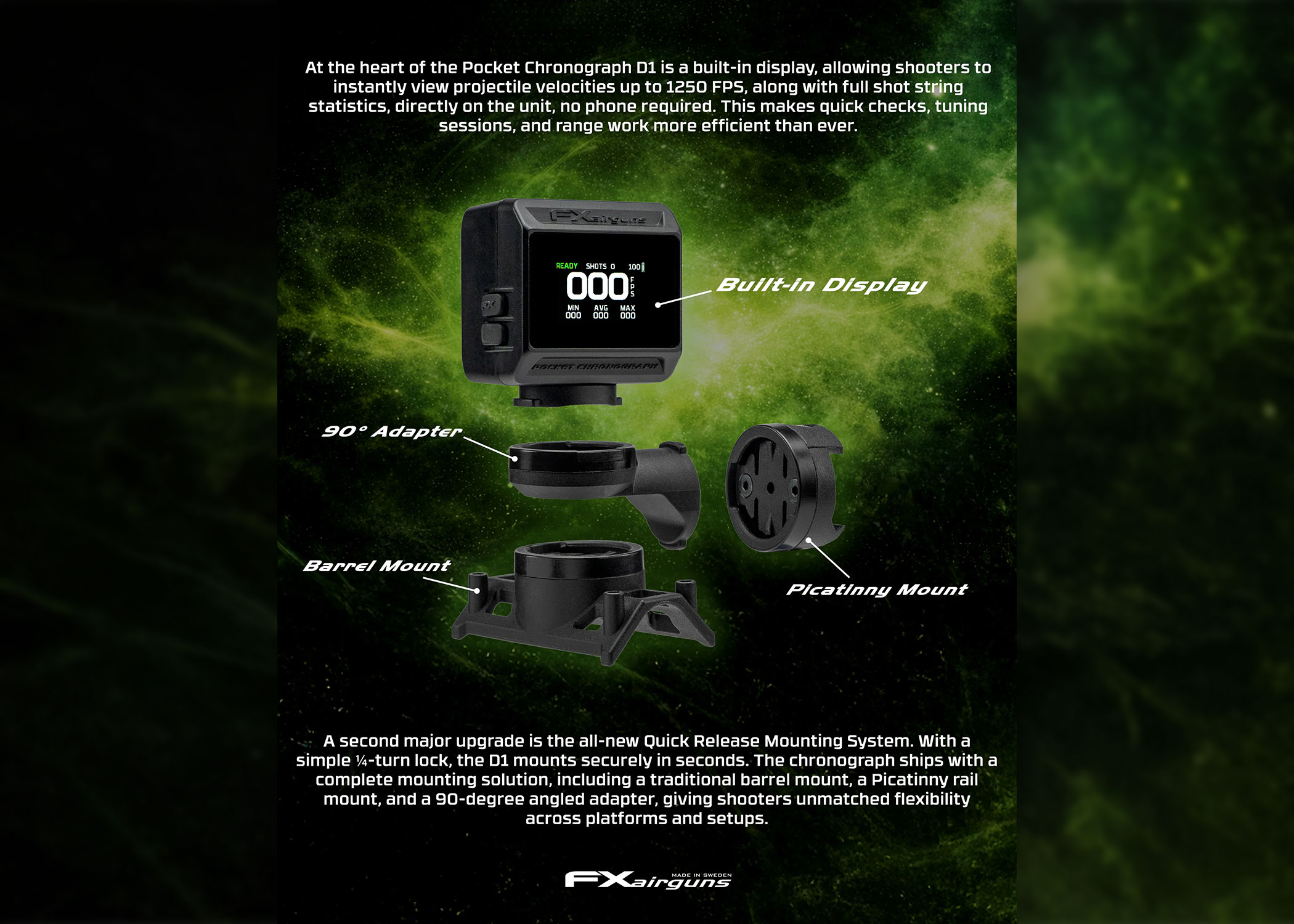 The Pocket Chronograph D1 paired with the new quick-disconnect mount, it offers a wide range of mounting options and makes it easier than ever to monitor your rifle and projectile performance.
